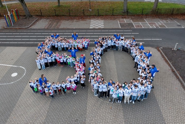 Vanwege de weersomstandigheden moest het geplande fotomoment tijdens de feestweek worden uitgesteld, maar wat in het vat zit, verzuurt niet. Deze week was het zover: onder een stralende hemel en gestoken in de nieuwe schoolshirts, vormden alle leerlingen en medewerkers samen het cijfer 50 voor een spectaculaire luchtfoto. Een blijvende herinnering aan dit gouden jubileum.