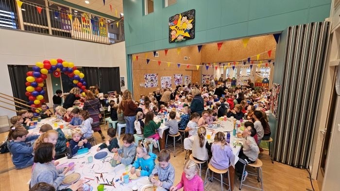 De feestelijkheden startten op school met een gezamenlijke pannenkoekenlunch in de centrale hal. Een mooi moment van verbinding waarbij leerlingen uit alle groepen door elkaar aan lange tafels zaten. Het team verraste de kinderen tijdens dit officiële moment met een speciaal geschreven jubileumlied.