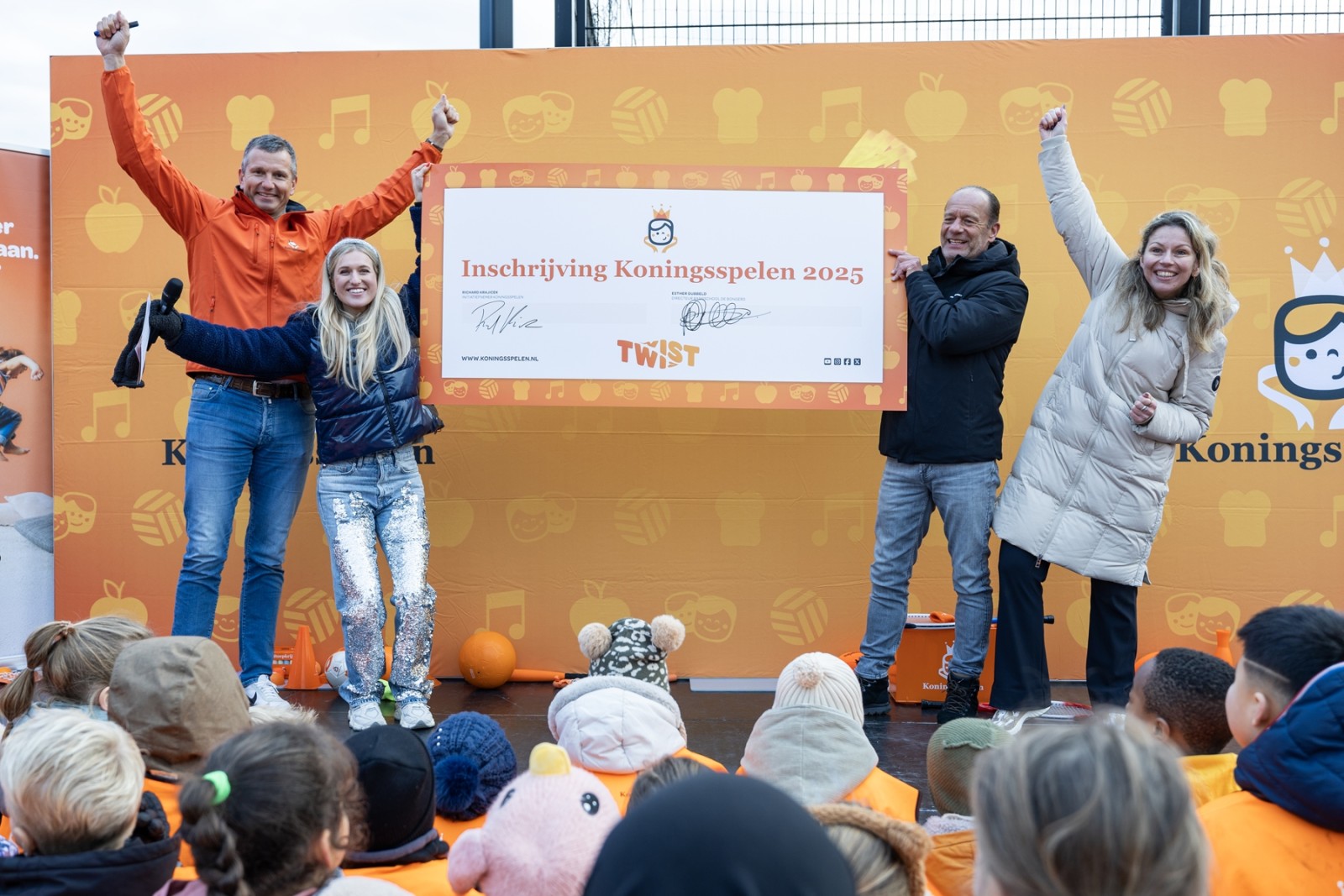 Directeur Esther Dubbeld mocht samen met Richard Krajicek de Bongerd als eerste inschrijven voor de Koningsspelen 2025. Een Kinderen voor Kinderen-koor liet het Koningsspelen-lied van dit jaar voor het eerst horen: ‘Bailabailala’.