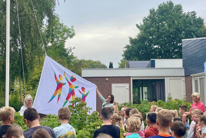Verbindende Voila vlaggen wapperen bij de start van het schooljaar.
